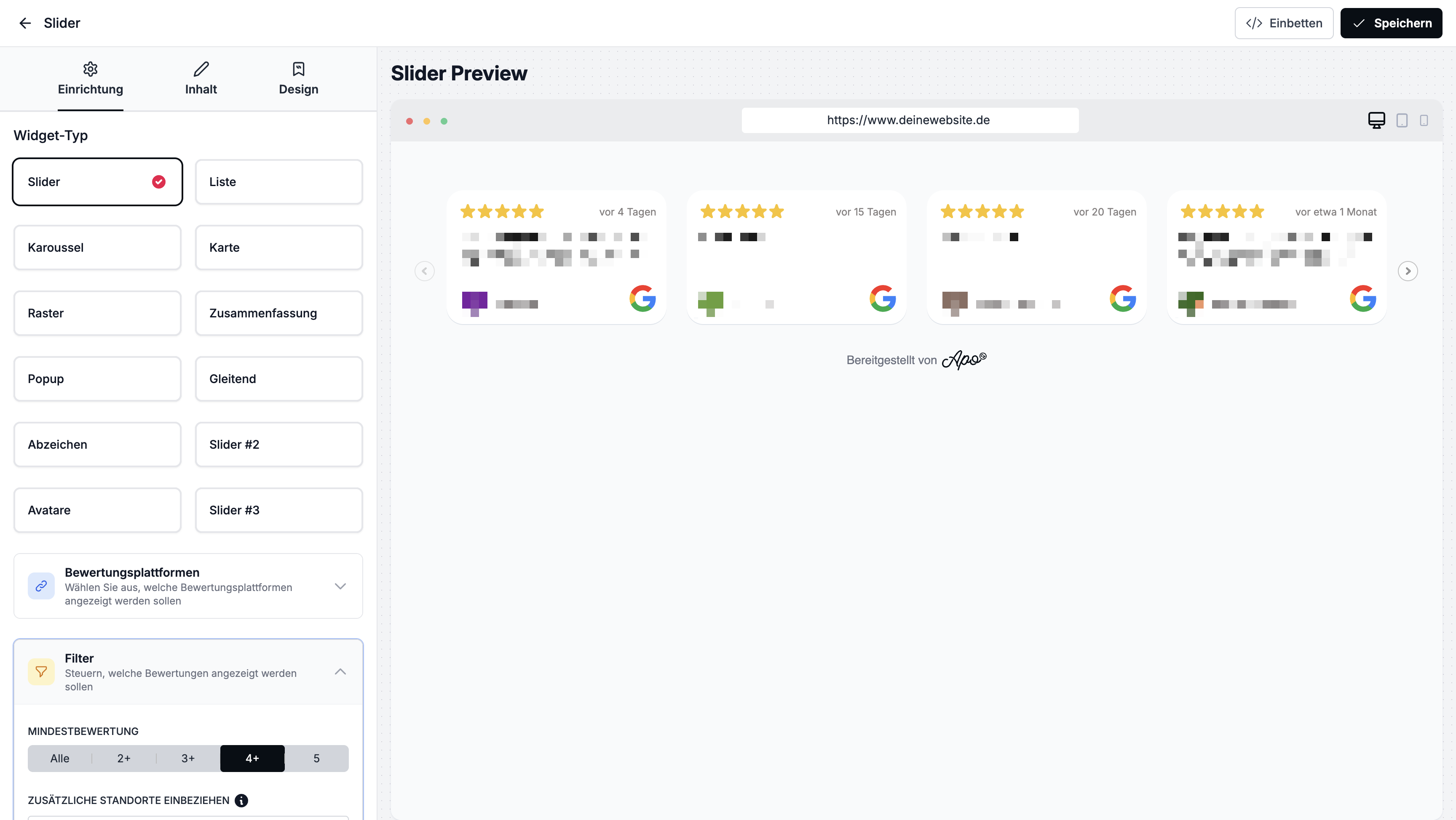 Konfiguriere die weiteren Optionen: Branding, Bewertungsplattformen, Filter, SEO Review Snippets und Sprache.