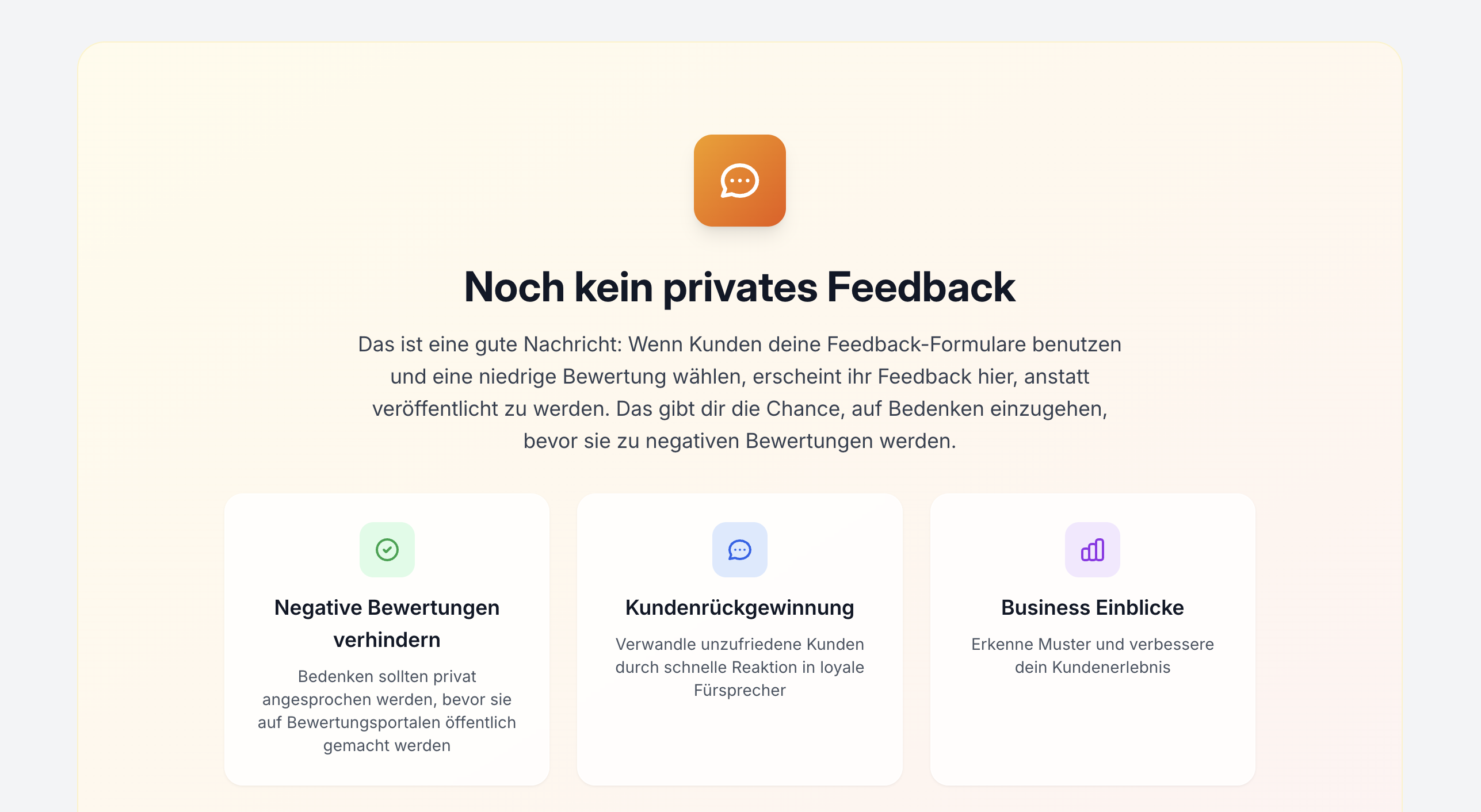 Feedback-Formulare sind ein wirksames Mittel, um das Risiko zu verringern, dass negative Bewertungen Deine Online-Reputation beeinträchtigen. Wenn unzufriedene Kunden versuchen, eine negative Bewertung abzugeben, erkennt unser System dies und leitet den Kunden weiter, damit er privates Feedback hinterlassen kann. In diesem Leitfaden erfährst Du, wie Du privates Feedback innerhalb der Apo.cx-Plattform verwalten kannst.