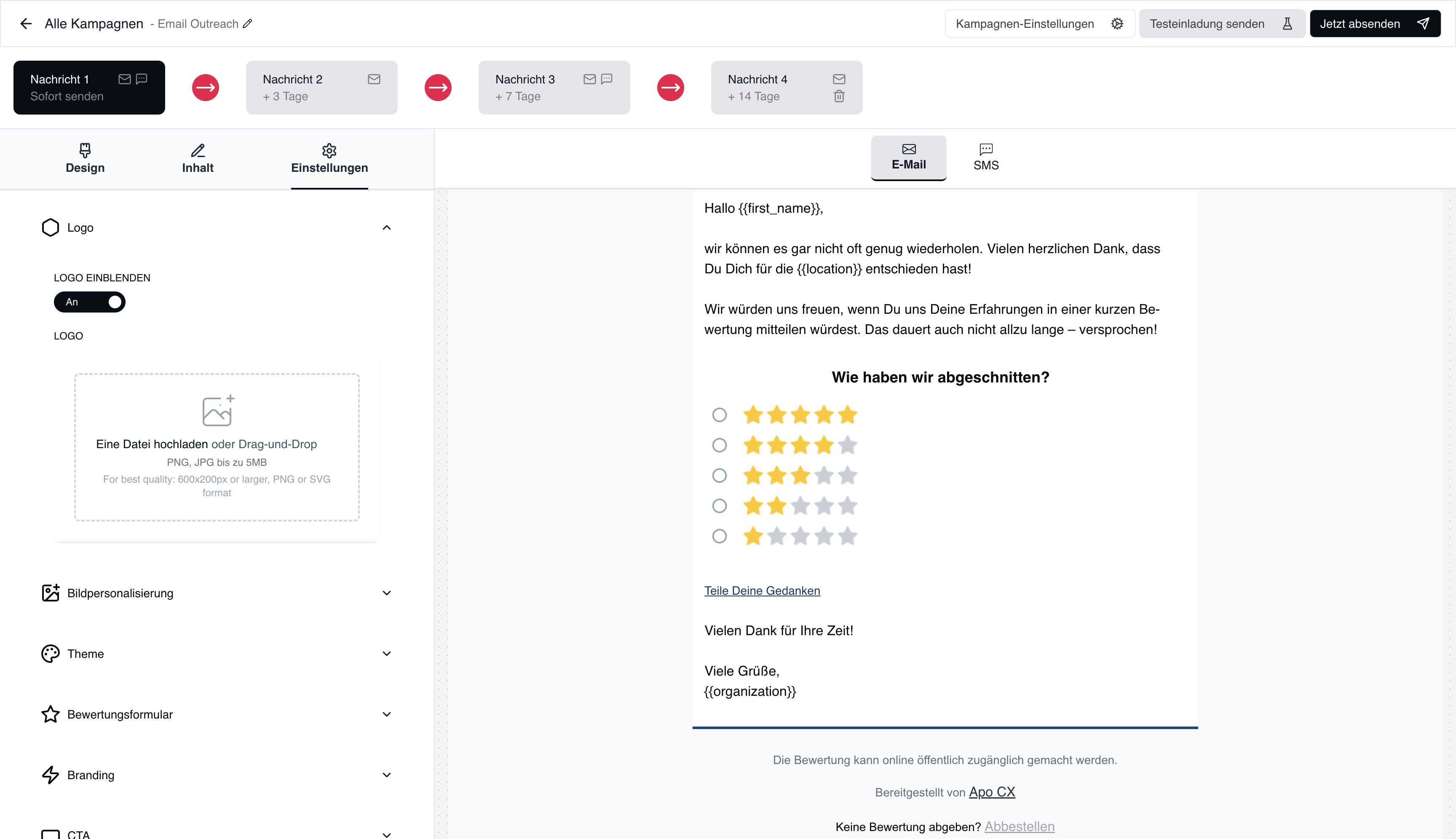 Branding: E-Mail-Adresse aktualisieren und Apo.cx-Branding in der Fußzeile der E-Mail ausblenden (im B3-Plan möglich).