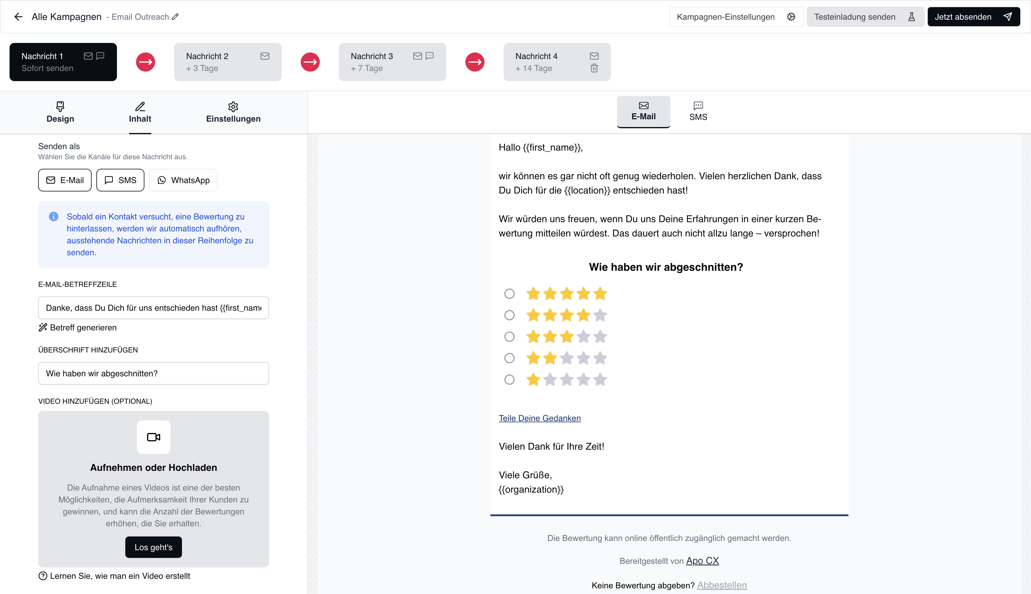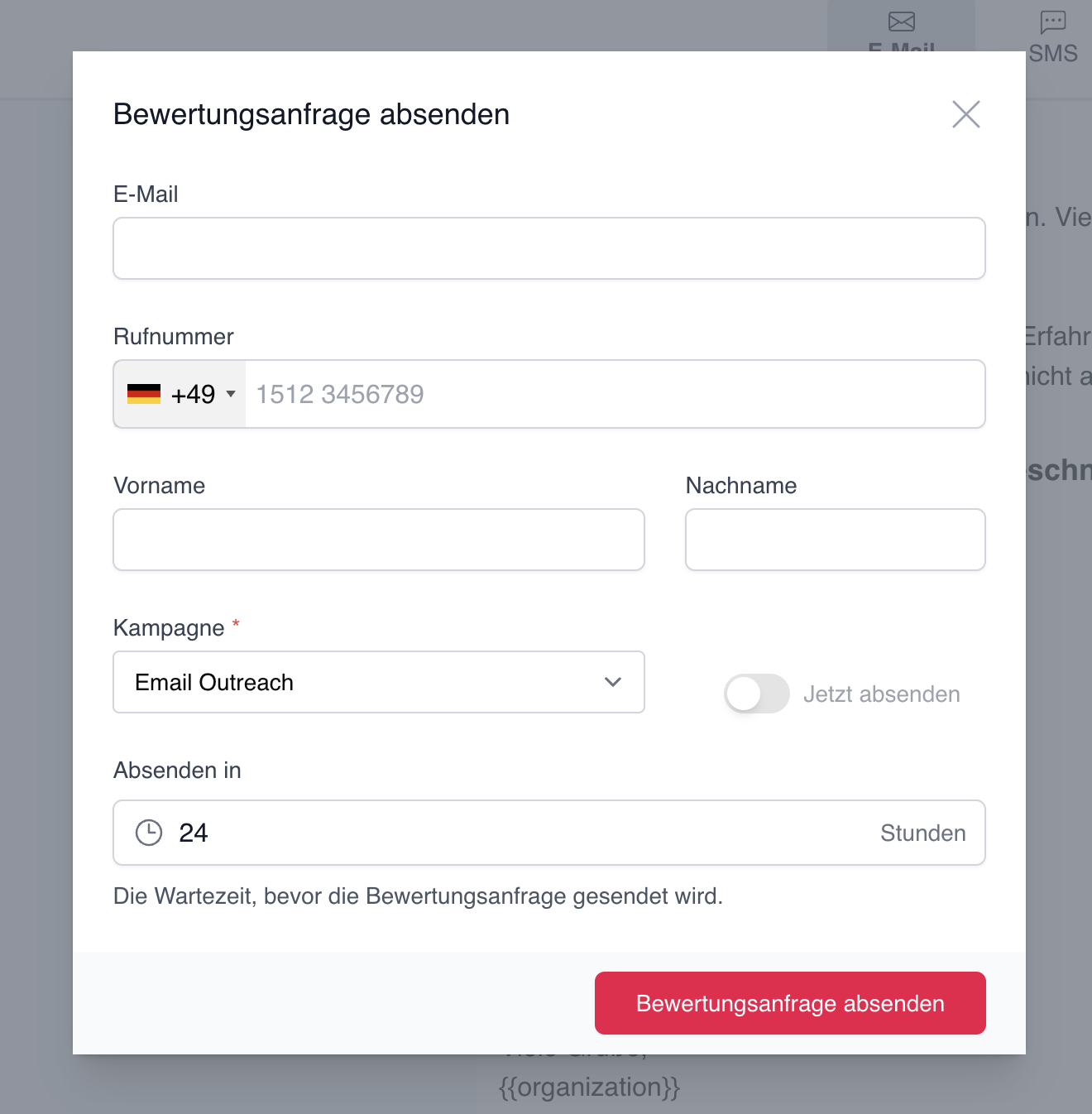 In den „Erweiterten Einstellungen“ kannst Du festlegen, ob E-Mails im reinen Textformat gesendet werden sollen. Hier kannst Du auch festlegen, welche Kanäle für die Kampagne genutzt werden sollen: „Nur E-Mail“, „Nur SMS“ oder „E-Mail und SMS“. Zusätzlich hast Du die Möglichkeit, eine Wartezeit in Stunden festzulegen, bevor die Bewertungsanfrage gesendet wird.