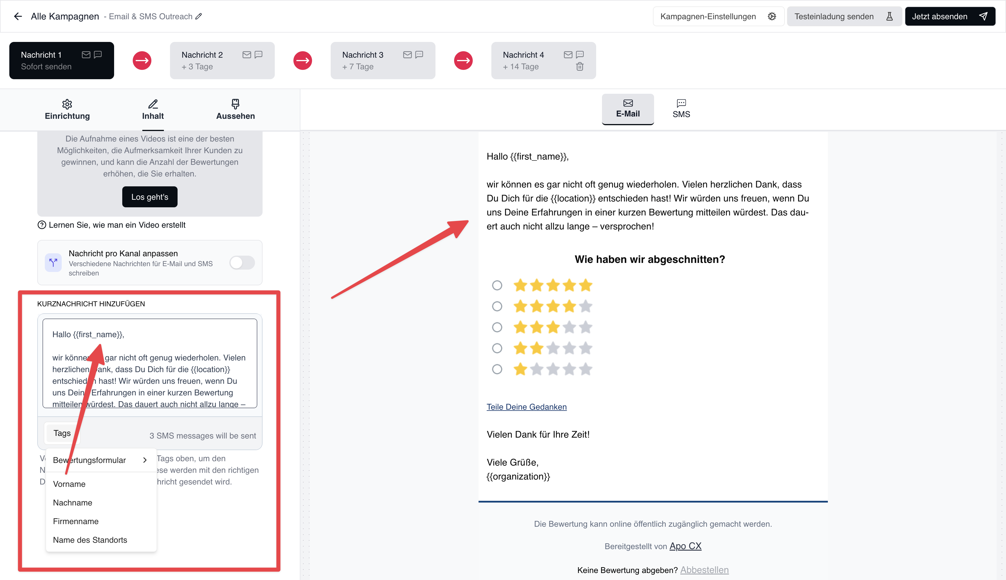 Im Abschnitt “Kurznachricht” kannst Du den Text der E-Mail anpassen. Es stehen Dir die folgenden Platzhalter („Tags”) zur Verfügung:
