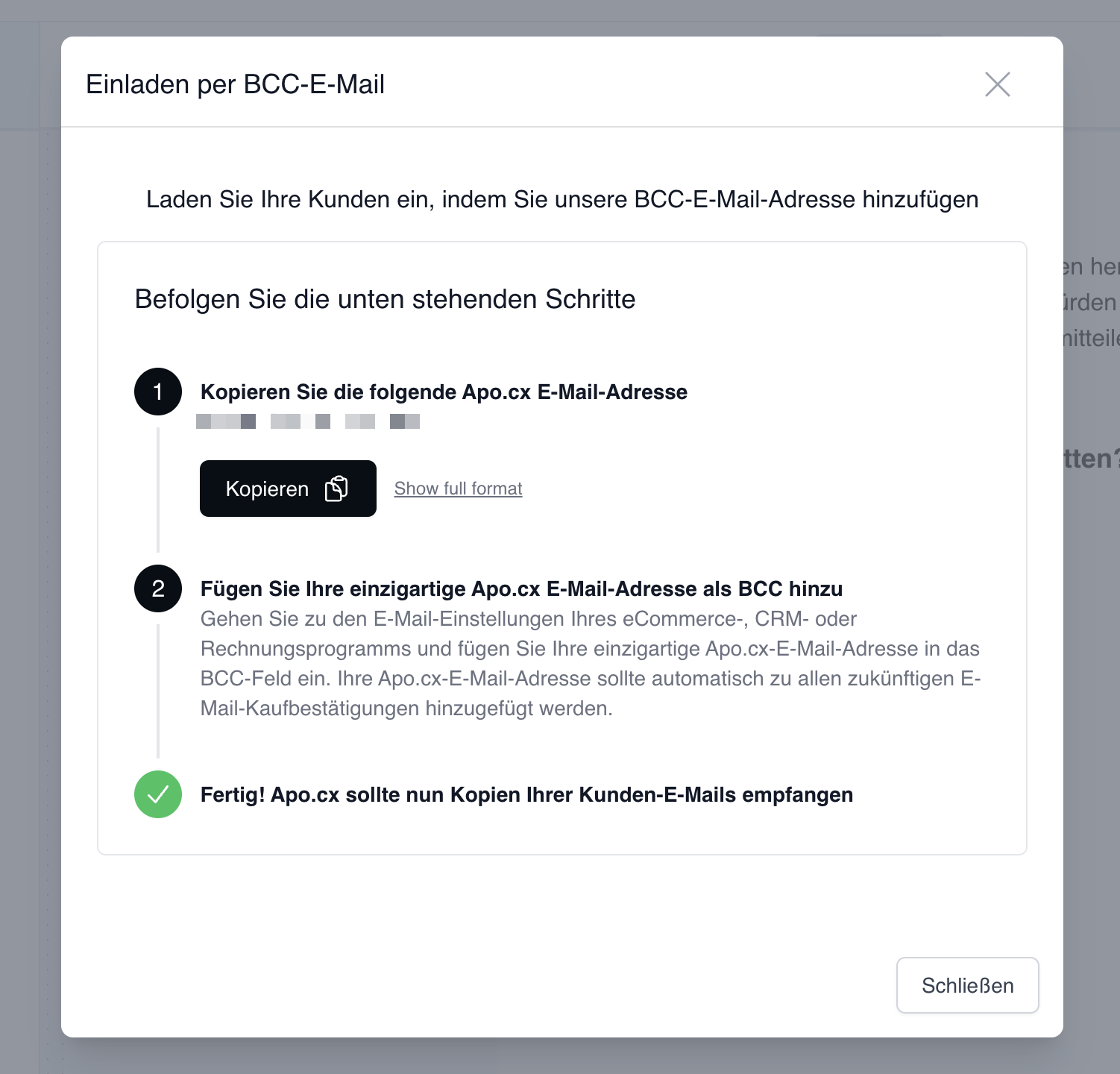 Du musst diese E-Mail-Adresse nur noch in den E-Mail-Einstellungen Deines E-Commerce-, CRM- oder Fakturierungssystems in das BCC-Feld eintragen. Bei allen zukünftigen Bestellbestätigungen, die Du per E-Mail an Deine Kund*innen sendest, werden diese dann automatisch Apo.cx-Bewertungskampagnen hinzugefügt.