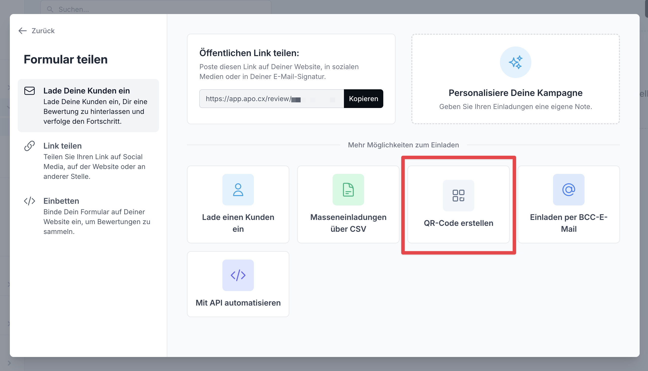Alternativ kannst Du auch direkt zu “Bewertungstools” und “QR-Codes” gehen.