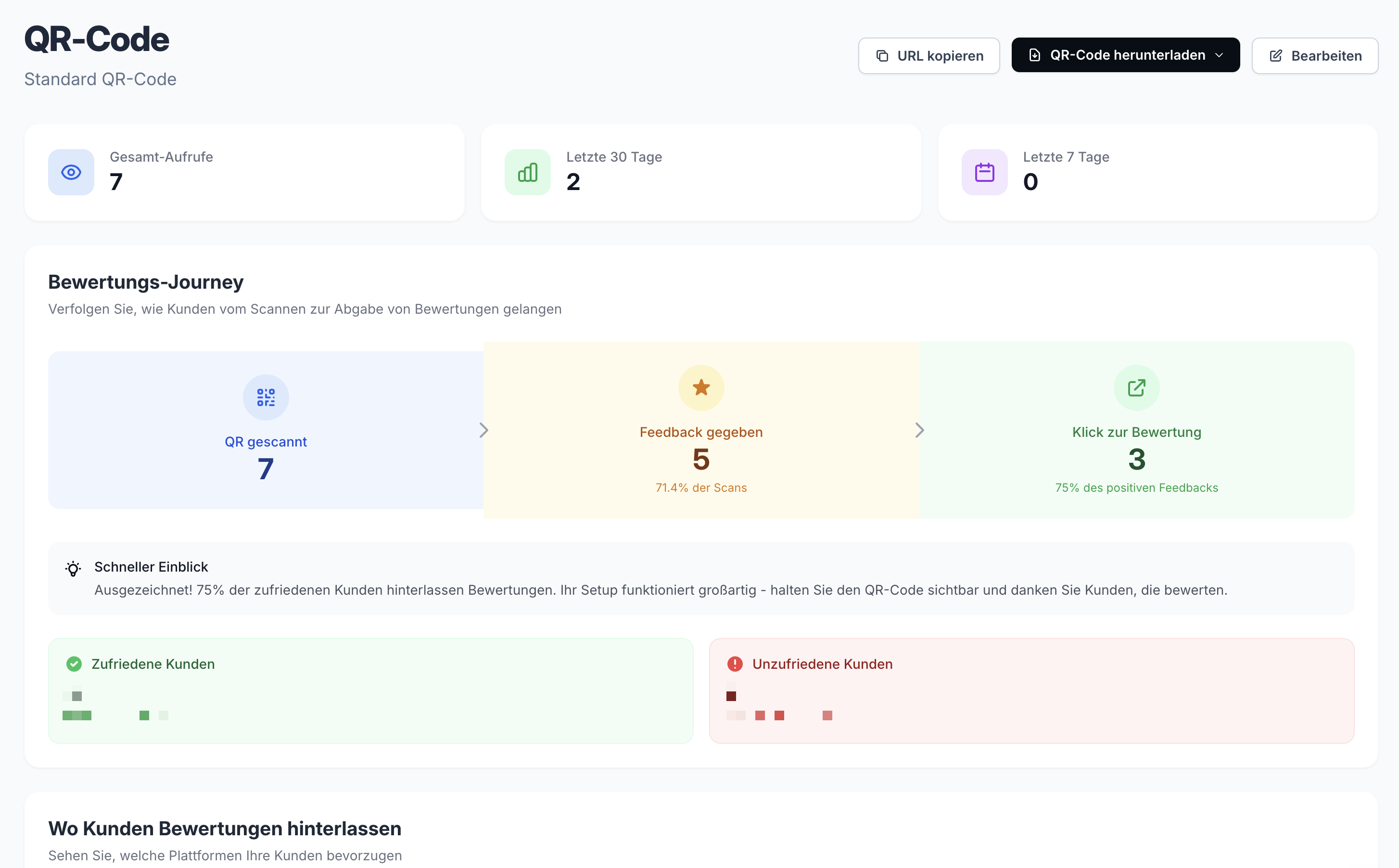 Unter “Bewertungstools” und “QR-Codes” findest Du alle die von Dir generierten QR-Codes inklusive Details über die Anzahl der Scans und der darüber generierten Bewertungen.