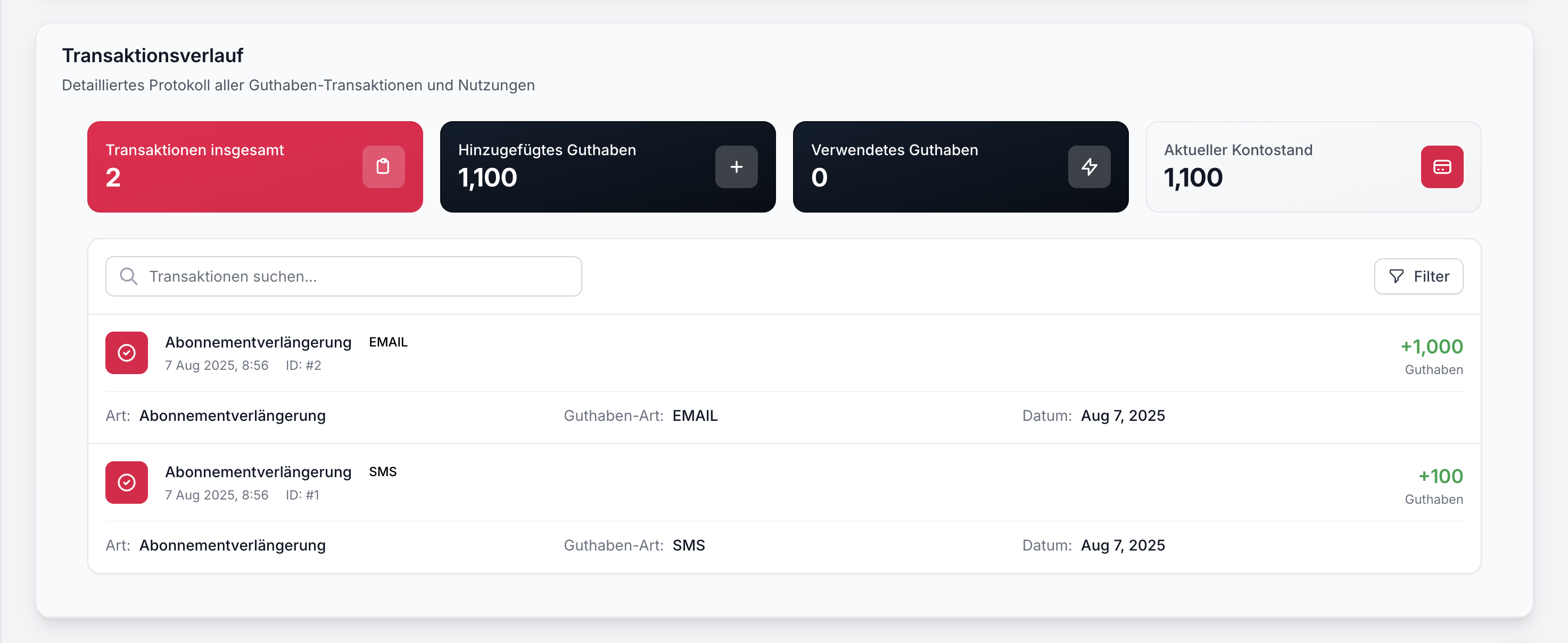 Auf der Seite „Guthaben-Nutzung & Saldo“ werden Dir die im Zeitverlauf verbrauchten Credits sowie die verbleibende Gesamtzahl an E-Mail- und SMS-Credits angezeigt. Im Transaktionsverlauf steht Dir außerdem ein detailliertes Protokoll aller Guthabentransaktionen und -nutzungen zur Verfügung.