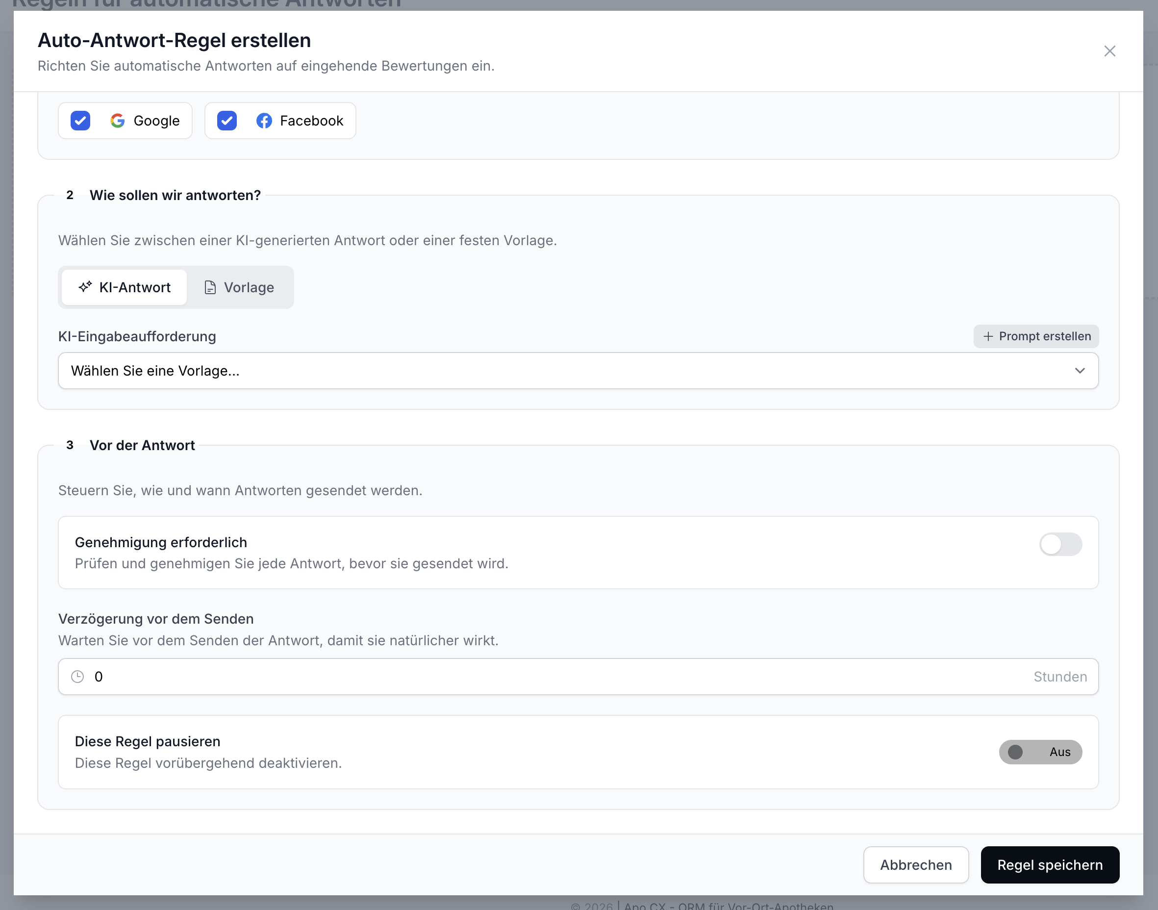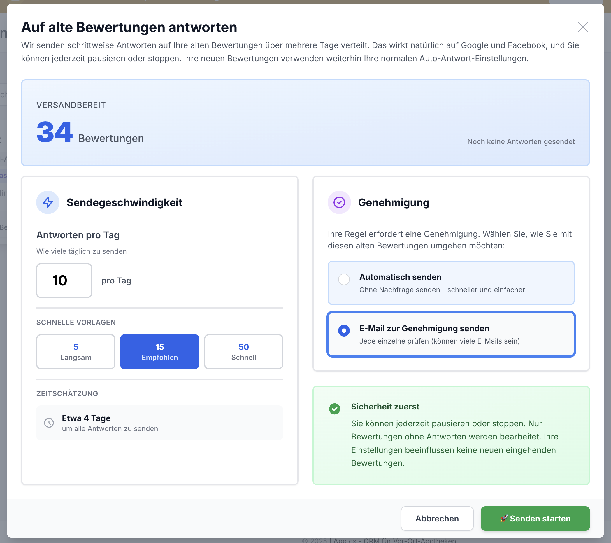 Im Modal kannst Du auswählen, wie viele Bewertungen pro Tag beantwortet werden sollen und ob diese automatisch oder erst nach manueller Genehmigung gesendet werden sollen.