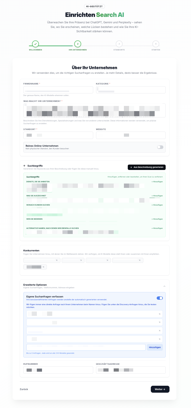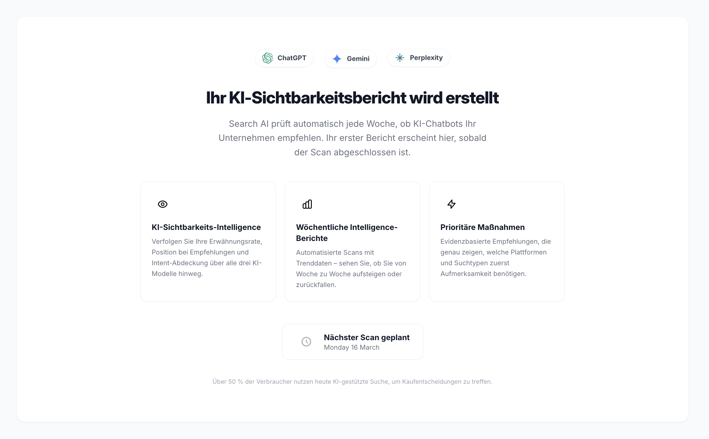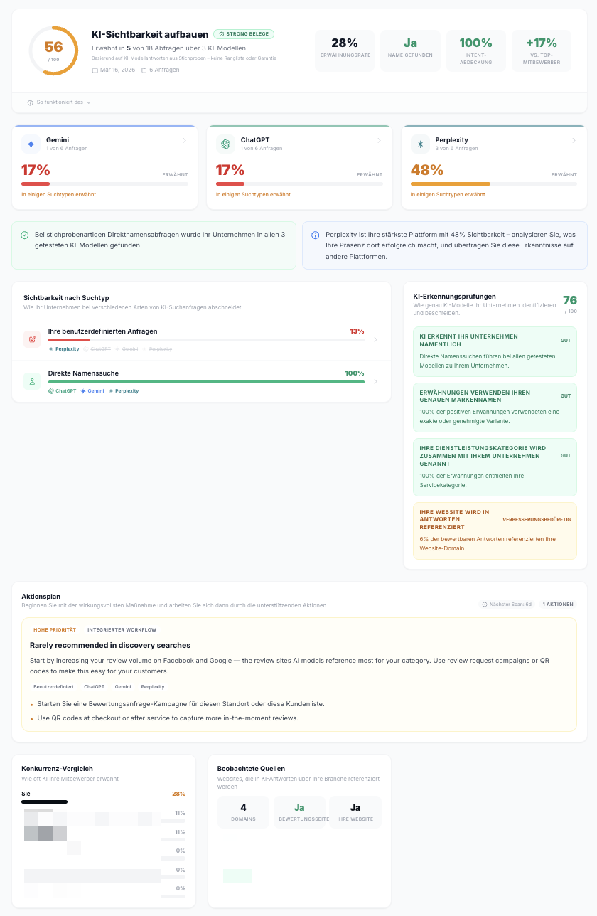 Überwache deine Präsenz bei ChatGPT, Gemini und Perplexity, um zu sehen, wo Du erscheinst, welche Lücken bestehen und wie Du deine KI-Sichtbarkeit gezielt stärken kannst.