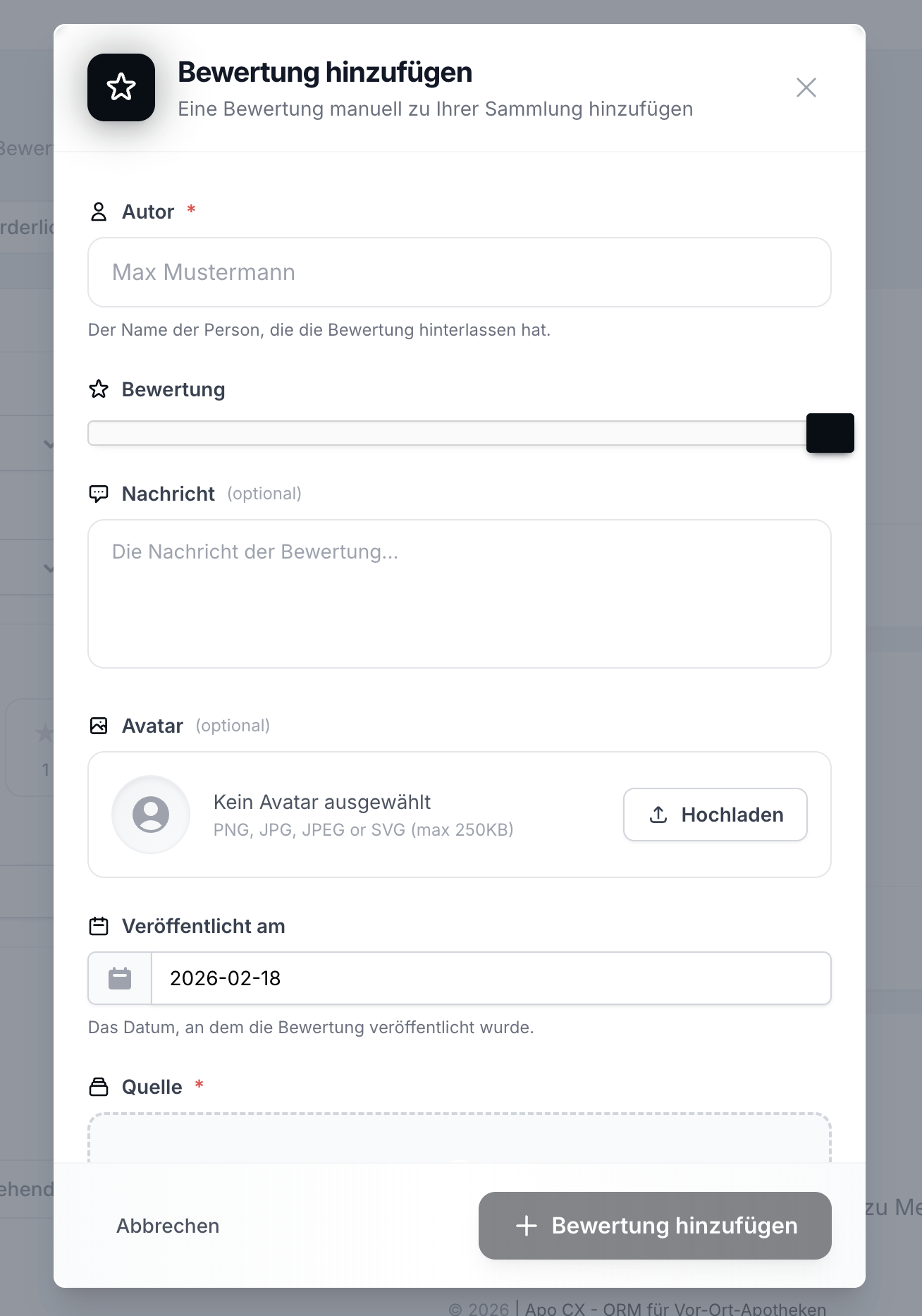 Bitte stelle sicher, dass Du bereits eine benutzerdefinierte Plattform erstellt hast. Jede Bewertung muss mit einer Bewertungsquelle verknüpft sein. Bei der Synchronisierung von Bewertungen aus offiziell unterstützten Bewertungsseiten erfolgt dies automatisch, beim Hochladen von Bewertungen musst Du jedoch vorab eine benutzerdefinierte Quelle erstellen.